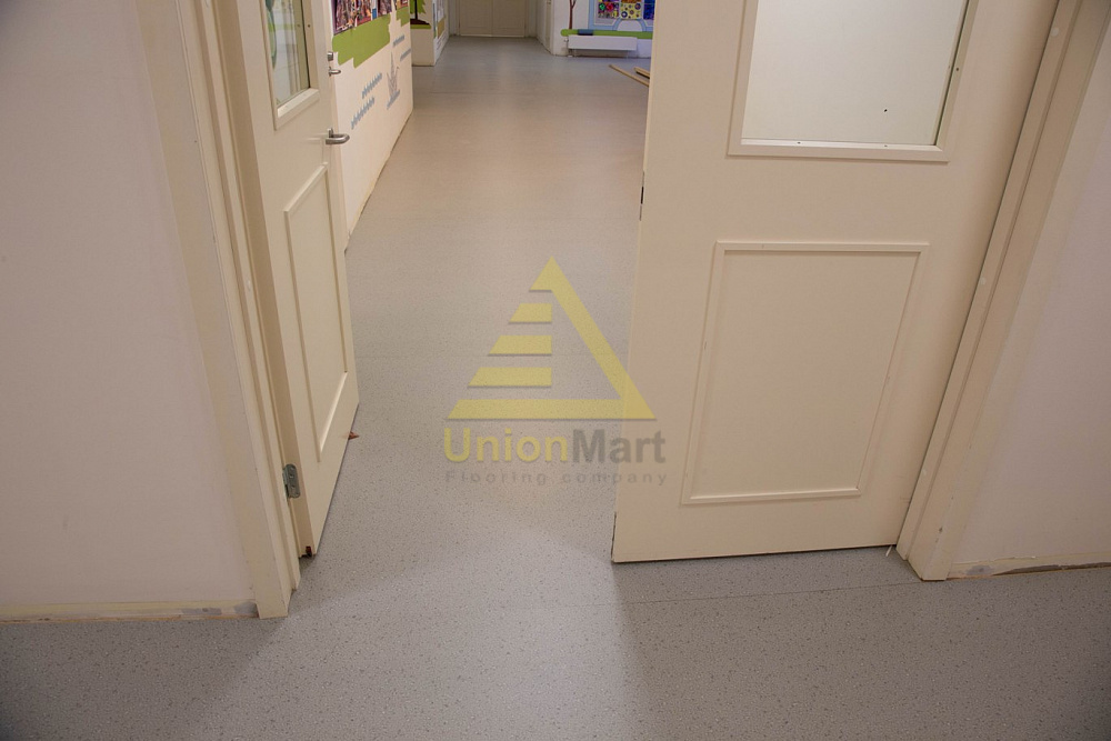 Укладка ПВХ покрытия в рулоне в классах и коридорах гимназии с предварительным шлифованием поверхности основания