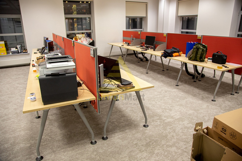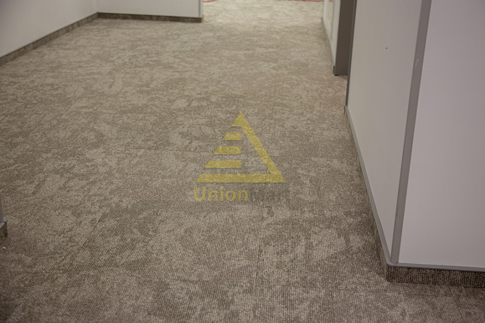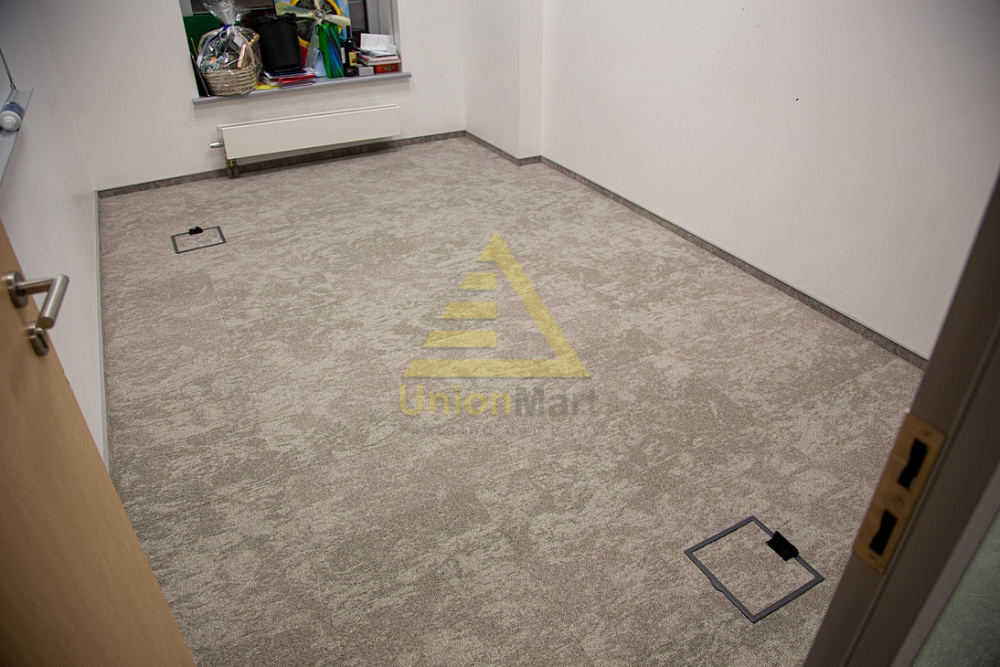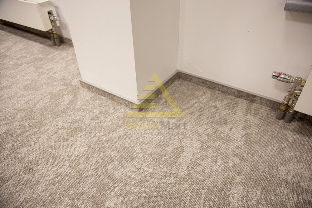 Замена ковровой плитки в действующем офисе компании, установка плинтуса с ковровой вставкой. Монтаж грязезащиты.