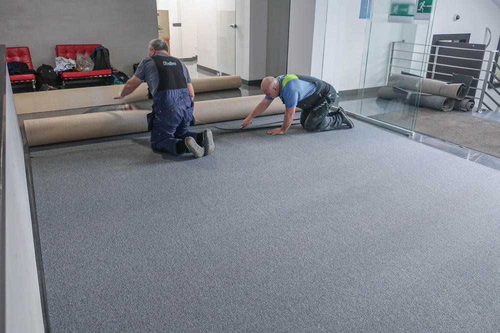 Laying carpet roll coating in a single color on the prepared base by the customer, with a one year guarantee. The base surface must meet the basic requirements: