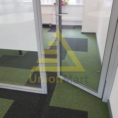 Укладка ковровой плитки Desso Essense с дизайном, с демонтажем старой ковровой плитки, приклеенной на клей вместо фиксации. Также в наши задачи входил перенос мебели в действующем офисе, локальный ремонт основания, вынос мусора.