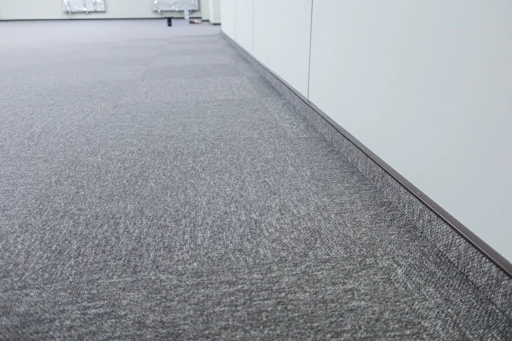 Из материала который укладывается на пол, вырезается полоса, которая вставляется в рамку плинтуса и крепится, таким образом ковровое покрытие заводится на стену и помогает создать эстетичный внешний вид